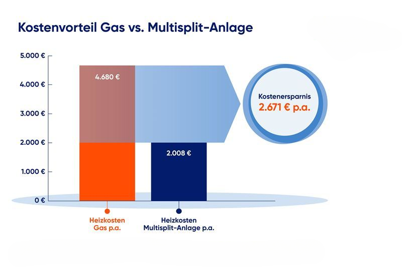 Gegenüber Gas: Eine Ersparnis von bis zu 2.700 € pro Jahr ist möglich, wenn die Klimaanlage einen Großteil der Heizlast übernimmt.